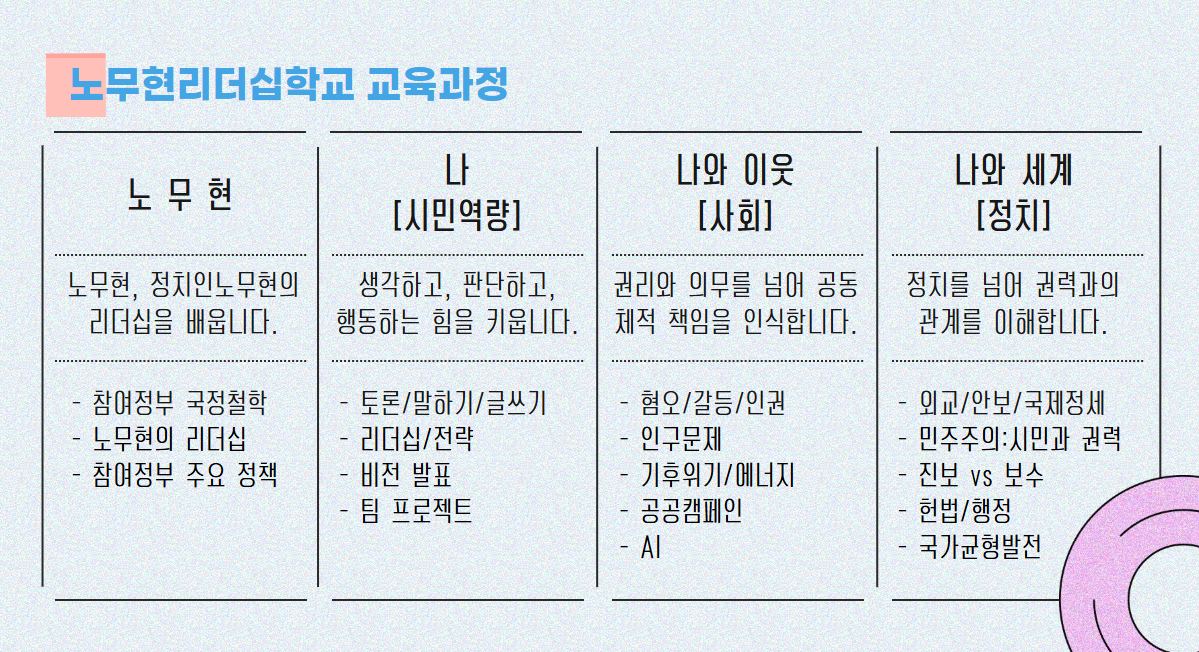 노무현리더십학교는학습하고 생각하는 시민,정치적 사고와 행동하는 시민을 키웁니다!민주주의든 진보든 국민이 생각하는 것 만큼 간다.사람들은 열심히 시민운동을 하고, 촛불을 들고, 정권을 잡기 위해 노력합니다. 세상을 바꾸자는 것이지요.그러나 민주주의든 진보든 국민이 생각하고 행동하는 만큼만 가는 것 같습니다. 시민운동도, 촛불도, 정권도, 이 한계를 넘어설 수는 없는 것 같습니다. 80년 반독재 투쟁이 성공한 것은 국민이 생각하는 만큼이었기 떄문일 것입니다. 우리는 두 번이나 정권을 잡고 노력했지만 그 동안의 민주주의와 진보의 성취 또한 국민이 생각하고 있는 수준 그 이상을 넘어서지는 못한 것 같습니다. [진보의 미래 서문]노무현 대통령의 어록하면 가장 먼저 떠오르는 문장 '민주주의 최후의 보루는 깨어있는 시민의 조직된 힘이다' 이 문장에 등장하는 깨어있는 시민! 우리는 깨어있는 시민이란 무엇일까? 고민하며, 노무현 대통령의 마지막 저서 [진보의 미래]에서 그 힌트를 얻었습니다.학습하고 생각하는 시민정치, 정책과 우리의 가치와 이해관계와의 인과 관계는 매우 복잡하여 여간해서는 이해하기가 어렵다. 그리고 야바위 같은 논리와 선전이 난무한다. 오랜 역사 동안 그랬다. 이 혼란스러운 상황을 정리하고 길을 찾을 수 있는 시민의 지혜와 용기가 필요하다. 학습이 필요하다. [진보의 미래 1부 7.시민의 역할은 무엇인가? ]정치적 사고와 행동하는 시민자기와 세계의 관계를 이해하는 사람, 자기와 정치, 자기와 권력과의 관계를 이해하고 적어도 자기의 몫을 주장할 줄 알고, 자기 몫을 넘어서 내 이웃과 정치도 생각할 줄 아는 사람 이런 것을 일반화 해서 정치적 사고와 행동을 하는 사람이 시민이라고 보는 것이죠 [진보의 미래 2부 5.역사의 진보와 시민의 역할]노무현리더십학교는 학습하고 생각하는 시민, 정치적 사고와 행동하는 시민을 키웁니다.